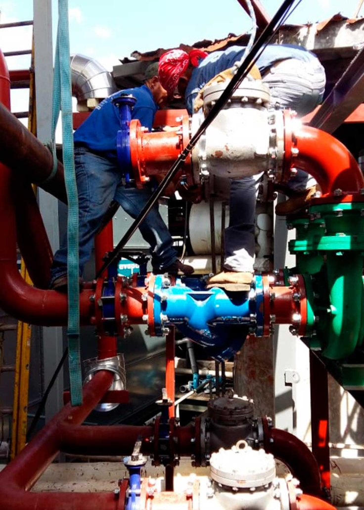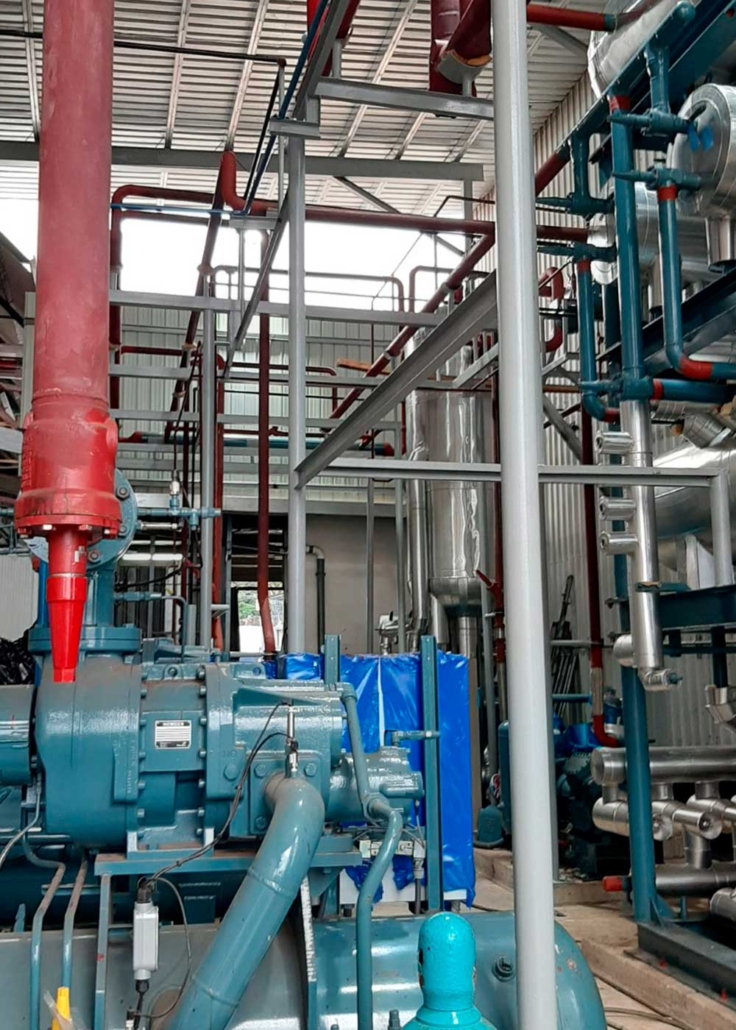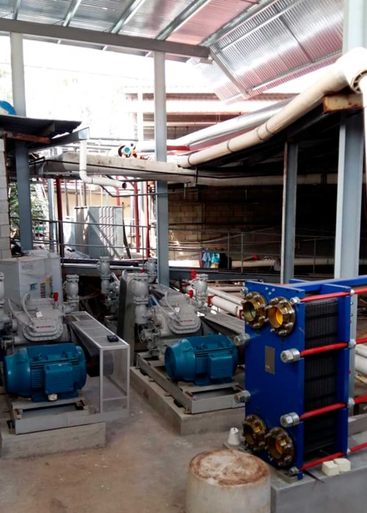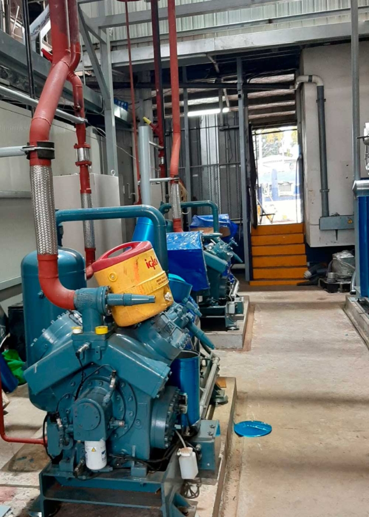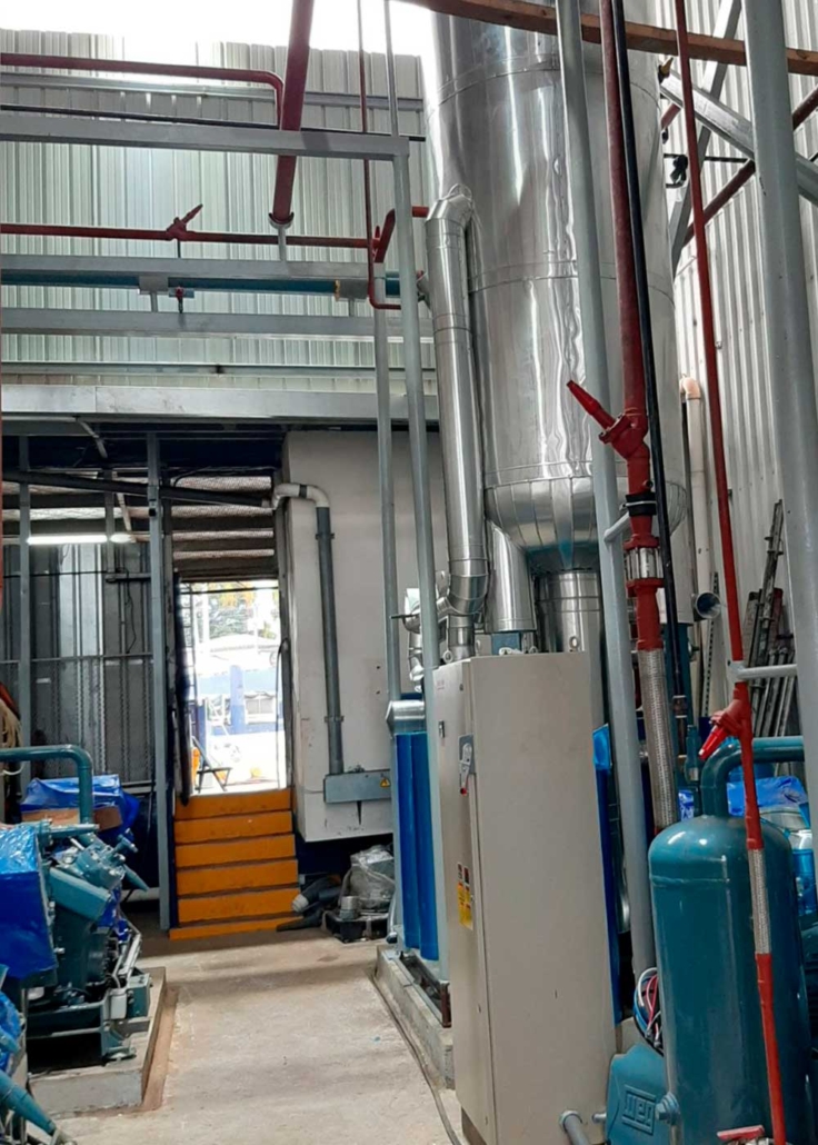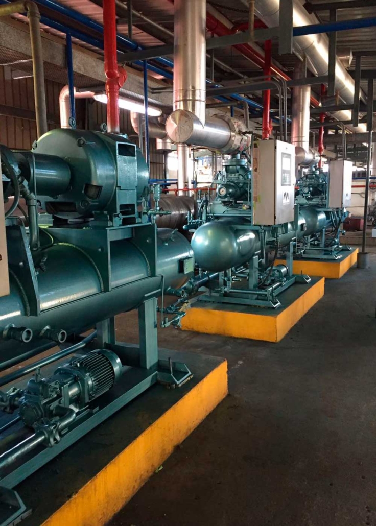 Diseño e instalación del sistema de refrigeración con amoniaco, el cual trabaja a una temperatura de evaporación de 10 ° F, cuenta con dos sistemas de refrigeración secundario los cuales trabajan con propilen-glicol, para enfriamiento de las cámaras de almacén de producto fresco, donde cada uno tiene una capacidad de 180 TR, el sistema en general tiene una capacidad de unas 1400 TR. En el sistema de baja temperatura cuanta con unas 125 TR el cual trabaja para congelación rápida como IQF y BLASS.